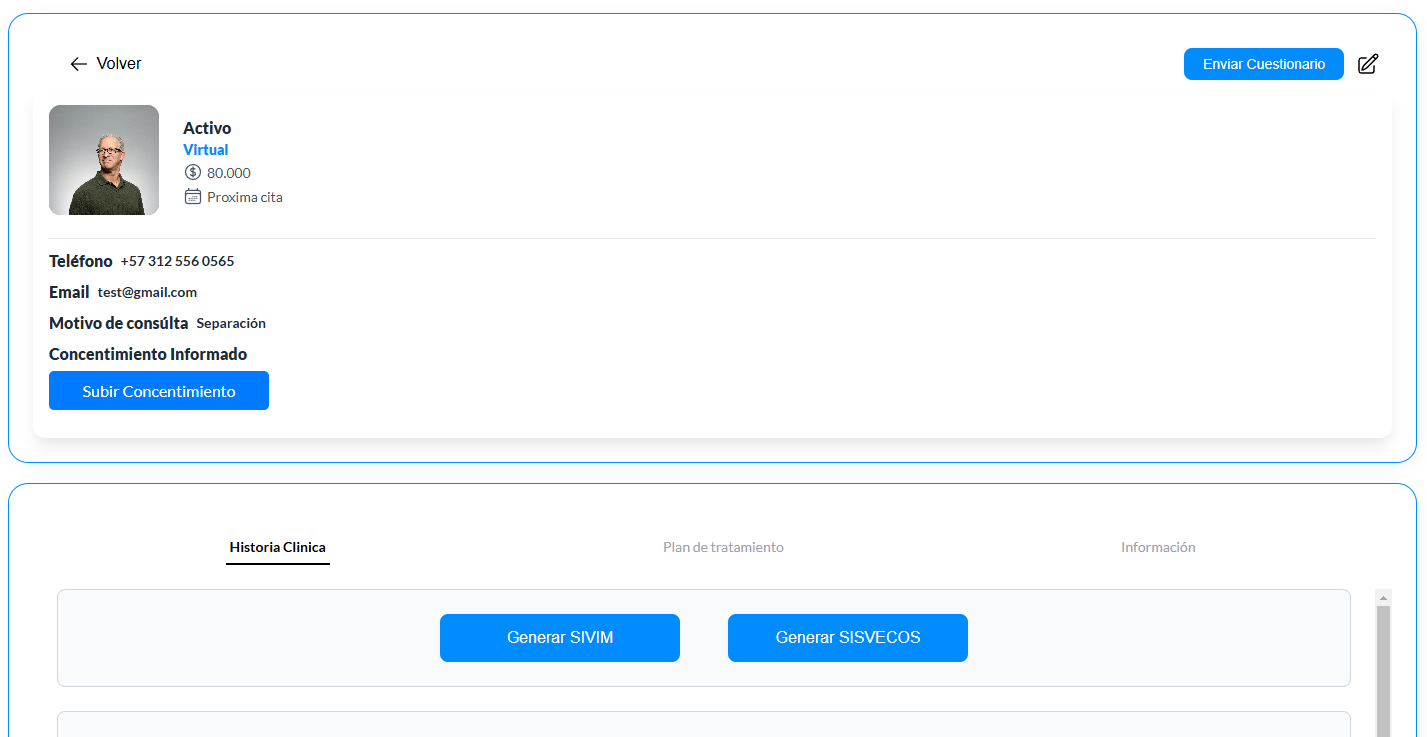 Envía cuestionarios a tus pacientes antes o después de las sesiones y recibe la información directamente en la plataforma. Agiliza la recopilación de datos y personaliza el seguimiento.